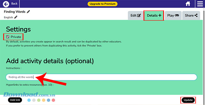 Bước 5: Mở tab Details để nhập hướng dẫn chơi game tại mục Instruction. Ngoài ra, mọi người có thể chọn Private để giới hạn người có thể vào truy cập vào Activity của mình. Nhấn Update để lưu thay đổi.