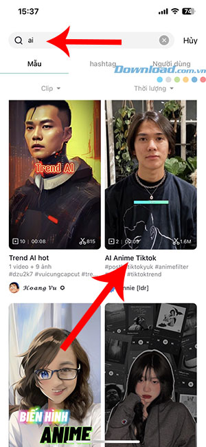 Bước 2: Nhập AI hoặc AI Manga vào thanh tìm kiếm ở trên cùng. Sau đó chọn một template biến hình manga ưng ý.
