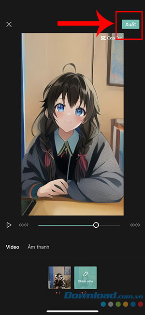 Bước 6: Sau khi đã ưng ý với video biến hình manga vừa tạo, mọi người cần nhấn nút Xuất để lưu video vào thư viện ảnh.