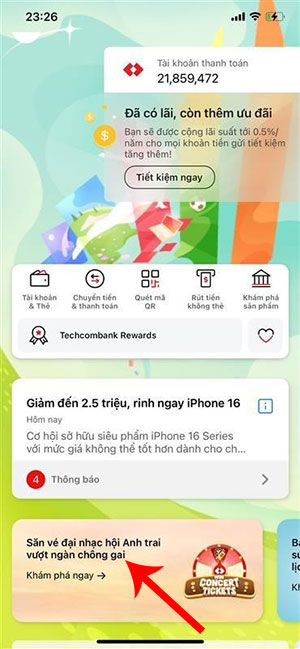 Bước 2: Nhấn vào Techcombank Rewards từ giao diện chính của ứng dụng.