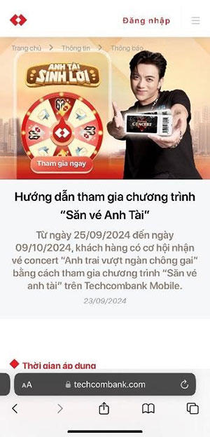 Vậy là chỉ với vài bước đơn giản, người dùng Techcombank cũng như ứng dụng ngân hàng điện tử Techcombank Mobile đã có thể tham dự chương trình Săn vé Anh Tài và có cơ hội sở hữu tấm vé tham gia concert Anh Trai Vượt Ngàn Chông Gai 2024 D2 tại Hà Nội hoàn toàn miễn phí.