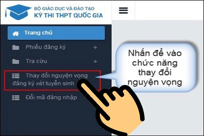Bước 2: Tại giao diện chính, nhấn vào Thay đổi nguyện vọng đăng xét tuyển sinh.