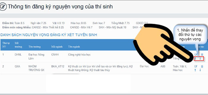 Bước 1: Nếu muốn thay đổi thứ tự nguyện vọng, ví dụ nguyện vọng 2 trở thành nguyện vọng 1, thí sinh cần nhấn vào mũi tên lên hoặc xuống để sắp xếp nguyện vọng đến vị trí mong muốn.