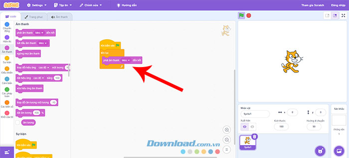 Trong dự án, mọi người có thể muốn tạo một vòng lặp âm nhạc. Khối đầu tiên cần thiết là Khi bấm vào cờ xanh từ phần Sự kiện. Tiếp theo, người dùng sẽ cần một khối để thực hiện vòng lặp, đó là liên tục. Nếu chỉ muốn lặp lại một số lần nhất định, hãy sử dụng khối lặp lại và thay đổi số thành số lần mong muốn.