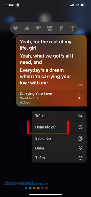 Bước 3: Khi menu pop-up xuất hiện, hãy nhấn vào tùy chọn Hoàn tác gửi để thu hồi tin nhắn đã gửi. Tính năng hoàn tác gửi hoạt động trong tối đa 2 phút sau khi gửi tin nhắn.