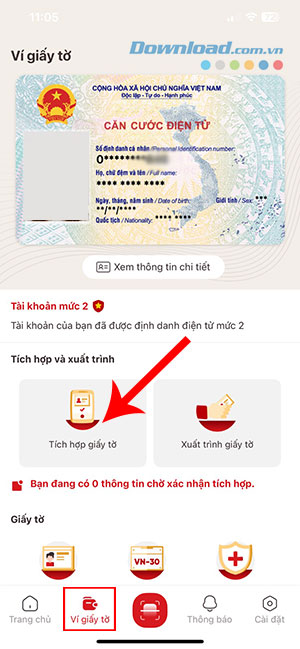 Bước 2: Truy cập tab Ví giấy tờ và chọn Tích hợp giấy tờ trong menu.