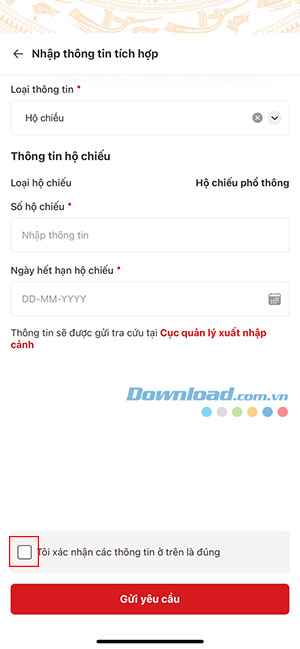 Bước 3: Nhấn nút Tạo mới yêu cầu tại trang Tích hợp thông tin. Sau đó, trong mục Loại thông tin, chạm vào Chọn thông tin để chọn Hộ chiếu.