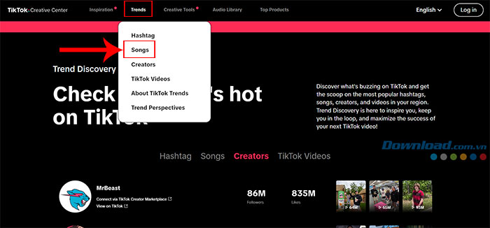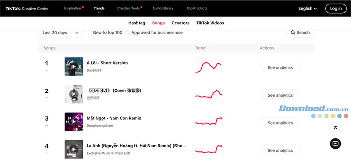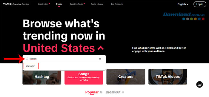 Mọi người chỉ cần click vào tab Trend và chọn Songs để khám phá bài hát thịnh hành trên TikTok từ nhiều quốc gia. Người dùng có thể chọn Vietnam để lọc nội dung trending tại Việt Nam.