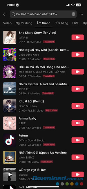 Sau khi kết quả tìm kiếm xuất hiện, chạm vào tab Âm thanh. TikTok sẽ hiển thị danh sách tất cả các âm thanh đang hot cùng với số lần chúng được sử dụng. Một số âm thanh này cũng được đánh dấu là Phổ biến dựa trên số lượng lớn video được tạo bằng âm thanh đó.