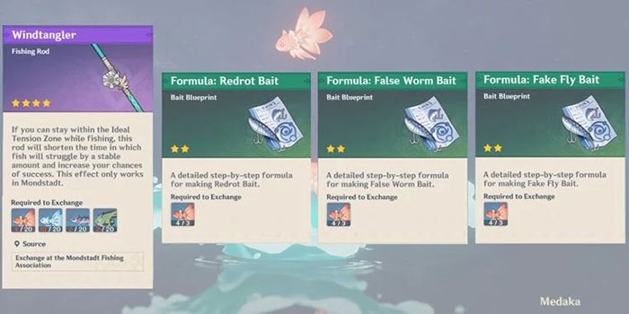 | Cần câu Windtangler | Hỗ trợ khi cuộn dây câu Chỉ hoạt động ở Mondstadt | Không | 20 Medaka 20 Aizen Medaka 20 Venomspine Fish 20 Tea-Colored Shirakodai |