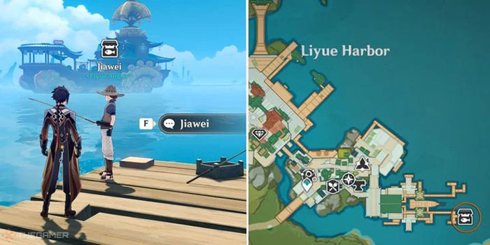 Hội Câu Cá Liyue nằm ở cuối bến tàu ở phía Đông Nam của Cảng Liyue. Nó được dẫn đầu bởi Jiawei, người có thể được tìm thấy bằng cách sử dụng điểm tham chiếu ở phía Nam của thành phố, đi xuống Adventurer's Guild và Blacksmith rồi đi thẳng tới. Cuối cùng, đi xuống bến tàu bên tay phải dưới cổng vòm lớn.