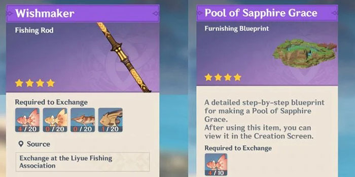 Hội Câu Cá Liyue chỉ bán 3 mặt hàng. Đầu tiên là Wishmaker, một chiếc cần câu sẽ rút ngắn thời gian đánh bắt ở Liyue và giúp việc câu cá trở nên dễ dàng hơn.