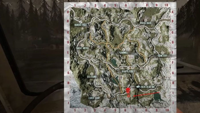 Đi theo con đường phía tây nam của Drunken Bear Inn cho đến khi đến ô I6. Người chơi sẽ tìm thấy một ngọn đồi có khoảng đất trống trên đỉnh ngay phía nam con đường.
