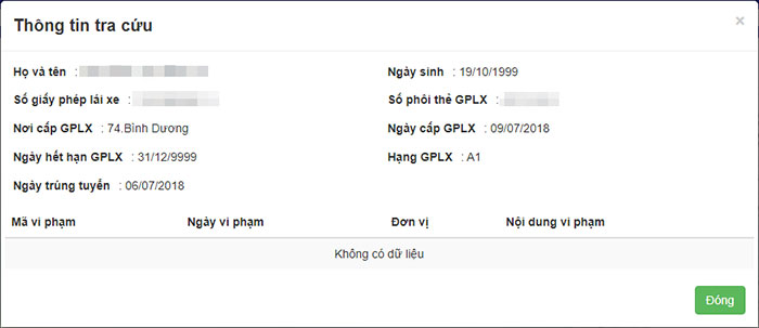 Sau đó, kết quả sẽ được hiển thị bên dưới bao gồm tất cả thông tin liên quan đến giấy phép lái xe như họ tên, số GPLX, nơi cấp và ngày cấp, hạng, ngày hết hạn,...