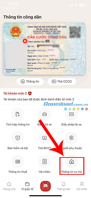Bước 2: Trong menu Ví giấy tờ, các loại thông tin mà ứng dụng lưu trữ sẽ xuất hiện. Người dùng cần nhấn vào Thông tin cư trú nằm ở cuối cùng của danh sách.
