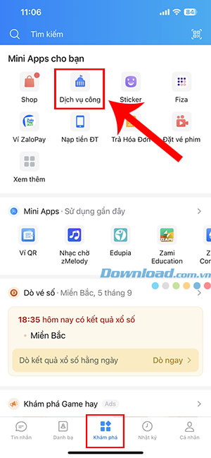 Bước 1: Mở ứng dụng Zalo trên thiết bị, sau đó truy cập tab Khám phá. Tại mục Mini Apps của bạn, chọn Dịch vụ công.