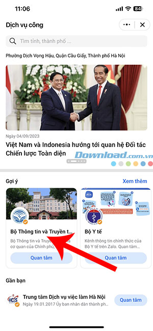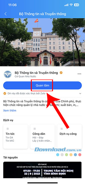 Bước 3: Nhấn nút Quan tâm trên trang Zalo OA của cơ quan tiếp nhận hồ sơ.