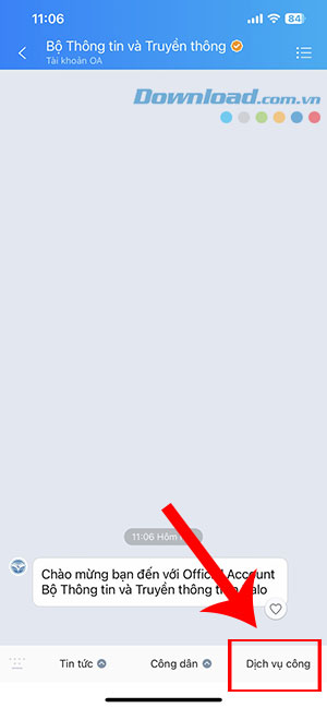 Bước 4: Khi giao diện cuộc trò chuyện mở ra, chọn Dịch vụ công.