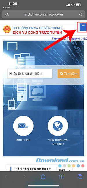 Bước 5: Sau khi được điều hướng tới trang Dịch vụ công trực tuyến của Bộ Thông tin và Truyền thông, chạm vào biểu tượng ba dấu gạch ngang ở góc trên cùng bên phải.