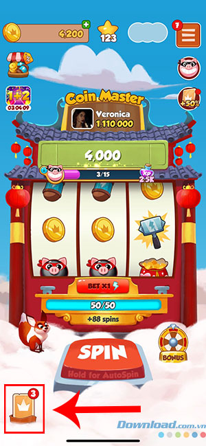 Bước 1: Đầu tiên, mở ứng dụng trò chơi Coin Master. Sau đó, nhấn vào biểu tượng Card ở góc dưới cùng bên trái màn hình, thao tac này sẽ mở ra bộ sưu tập thẻ của người chơi.
