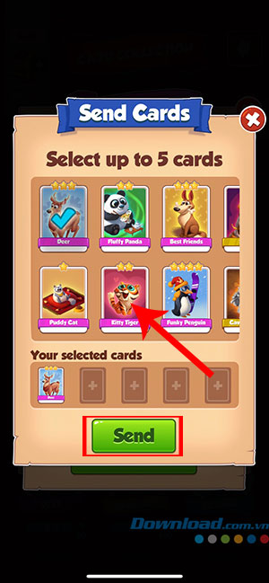 Bước 4: Nhấn nút Send và chọn một người bạn từ danh sách bạn bè trong Coin Master của mình rồi ấn Select Cards.