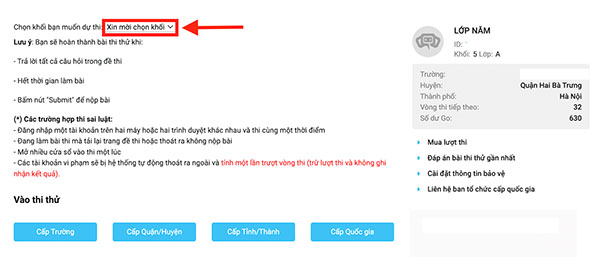 Bước 3: Tại giao diện Thi thử, người dùng chọn Khối muốn dự thi tại vị trí từ hộp chọn Xin mời chọn khối.