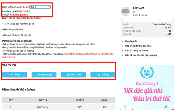 Các kỳ thi chính thức IOE chỉ dành cho học sinh thuộc đơn vị giáo dục đăng ký tổ chức thi. Do vậy, để tất cả các em học sinh có cơ hội tham gia thi trên hệ thống, IOE triển khai hoạt động Trải nghiệm thi (miễn phí) và Thi thử (đổi gói). Trong bài viết này, hãy cùng tìm hiểu cách truy cập thi thử trên IOE, giúp học sinh luyện tập nhiều dạng đề thi để trau dồi kiến thức và kỹ năng làm bài.