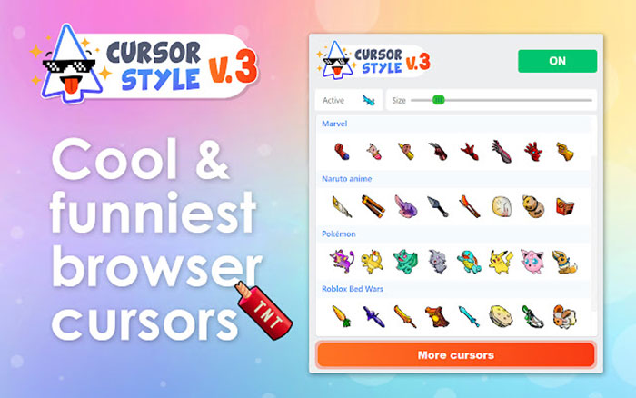 Cursor Style có hơn 300 slider tùy chỉnh cho mọi sở thích, được chia thành các danh mục, bên cạnh các slider chuyển động. Người dùng cũng có thể tùy chỉnh con trỏ của riêng mình, tương tự như 2 tiệc ích mở rộng trên.
