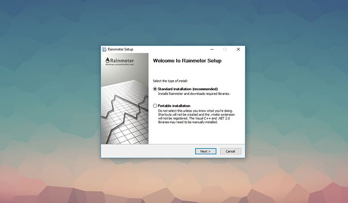 Bước 3: Khi đã mở tệp, nó sẽ điều hướng đến cửa sổ Rainmeter Setup. Chọn Standard installation, nhấn Next và đợi cho đến khi nó được cài đặt hoàn toàn trên máy tính.
