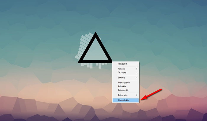 Bước 1: Nhấn Unload Skin từ menu Skin hoặc từ menu ứng dụng Rainmeter. Người dùng cũng có thể di chuột đến bất kỳ tiện ích nào và click chuột phải để gỡ các skin.