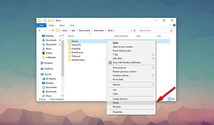 Bước 2: Ngoài ra, mọi người có thể xóa thư mục skin để xóa nó hoàn toàn khỏi cài đặt menu Rainmeter, tham khảo hình dưới đây hoặc có thể điều hướng bằng đường dẫn thư mục C:\Users\<UserName>\Documents\Rainmeter\Skins.