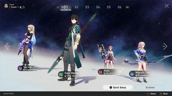 Ví dụ: một nhóm khởi đầu mẫu có thể bao gồm Dan Heng, Asta, Pela và Natasha. Asta là một đơn vị Harmony giúp tăng sức tấn công và tốc độ cho toàn đội, trong khi Pela là một đơn vị debuff làm giảm phòng thủ của kẻ thù. Natasha là người chữa lành vết thương của đội này, trong khi Dan Heng sẽ gây ra mọi sát thương. Đây là một nhóm chơi miễn phí cơ bản khá hiệu quả nhưng có thể không đáp ứng được những nội dung chiến đấu khó hơn.