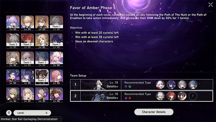 Cuối cùng, người chơi cũng sẽ muốn thêm một nhân vật đóng vai trò duy trì, bao gồm các đơn vị Preservation che chắn hoặc các đơn vị Abundance có tác dụng chữa lành. Điều này không đúng với tất cả các nhóm hoặc mọi dạng nội dung chiến đấu của HSR, nhưng đó là công thức cơ bản.
