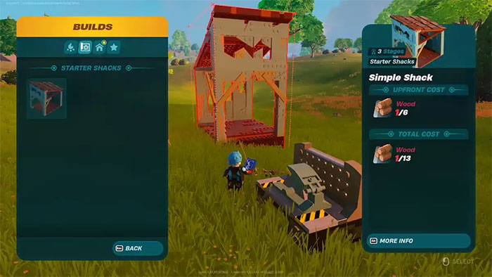 Menu Build trong LEGO Fortnite được chia thành các danh mục như Buildings và Utility. Người chơi có thể chọn từ những ngôi nhà được xây dựng sẵn hoặc xây dựng một ngôi nhà mới từ đầu và nên xây nhà ở khu vực gần quần xã sa mạc (Dry Valley) và tuyết (Frostlands).