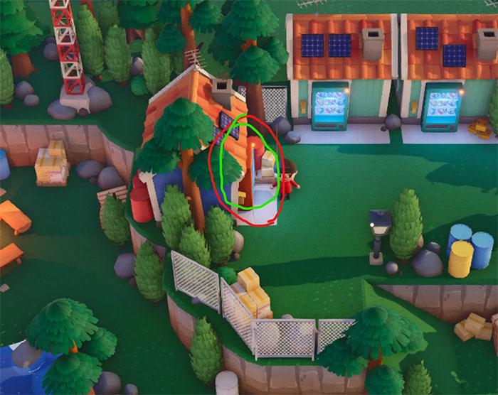 Đây là một ví dụ về vị trí xây nhà không tốt, vì mọi người không thể xây dựng trong vùng màu đỏ và sẽ mất rất nhiều không gian hữu ích, chưa kể những cây xanh cũng lấy đi không gian xung quanh.