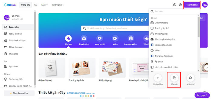 Bước 2: Nhấp vào nút Tạo thiết kế để chọn tùy chọn Sửa ảnh từ menu.