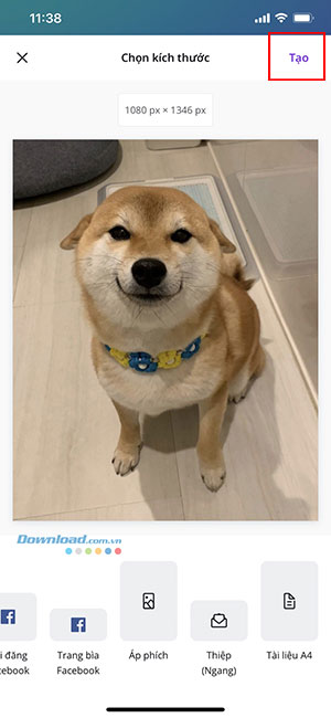 Bước 4: Tiếp theo, chọn kích thước cho hình ảnh và chạm vào Tạo ở góc trên cùng bên phải.
