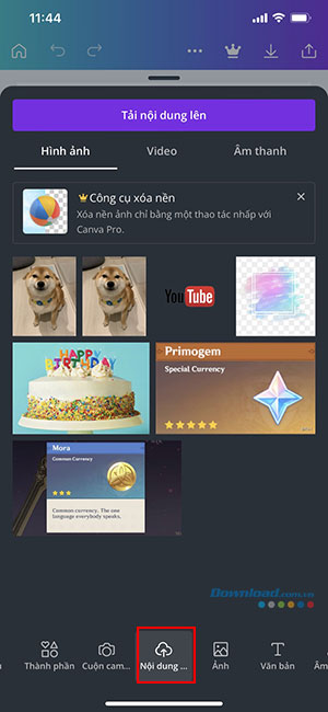 Bước 3: Trong mẫu trống, nhấn vào dấu cộng để hiển thị thêm tùy chọn. Mở tab Nội dung tải lên và chọn một hình ảnh có nền trong suốt