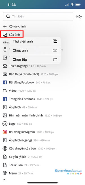 Bước 3: Chọn Sửa ảnh > Thư viện ảnh để tải ảnh lên, Chụp ảnh hoặc Chọn tệp.