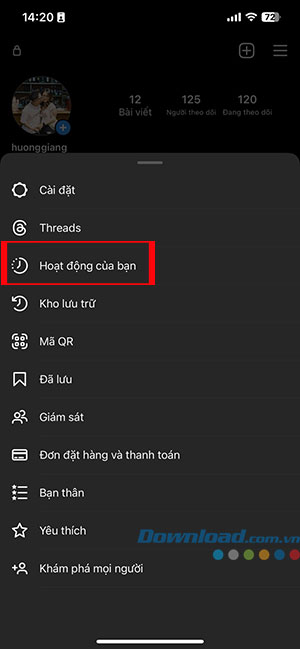 Bước 1: Mở Instagram, nhấn vào avatar để truy cập trang cá nhân. Sau đó, nhấn vào biểu tượng ba dấu gạch ngang ở góc trên cùng bên phải và chọn Hoạt động của bạn.
