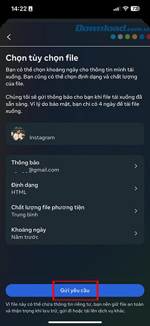 Bước 4: Chọn tùy chọn file như Định dạng, Chất lượng file và Khoảng ngày, nhấn nút Gửi yêu cầu. Instagram sẽ gửi thông báo qua email khi file tải xuống sẵn sàng. Người dùng có tối đa 4 ngày để tải file này.
