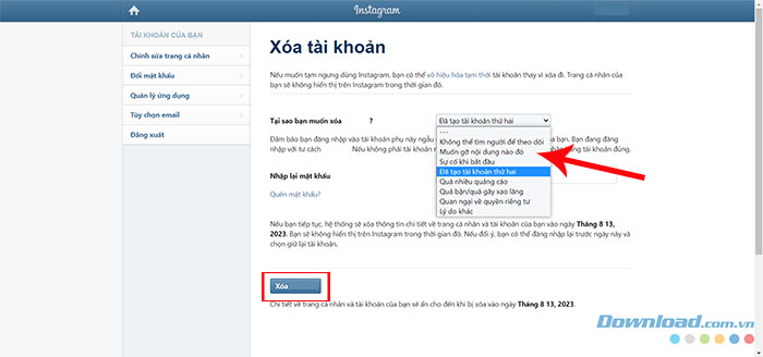 Bước 2: Chọn một lựa chọn trong menu thả xuống Tại sao bạn muốn xóa [tên tài khoản]? và nhập lại mật khẩu. Lựa chọn xóa tài khoản vĩnh viễn sẽ chỉ xuất hiện sau khi chọn lý do và nhập mật khẩu.