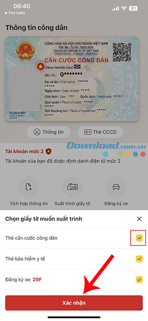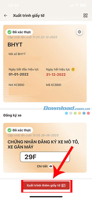 Để xuất trình thêm giấy tờ, hãy nhấn vào Xuất trình thêm giấy tờ và thực hiện chọn giấy tờ muốn hiển thị thêm.