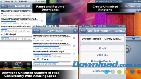- Hỗ trợ tạm dừng / tiếp tục hoặc hủy tệp tin tải xuống ở thời điểm bất kỳ thông qua hệ thống điều khiển dễ sử dụng.