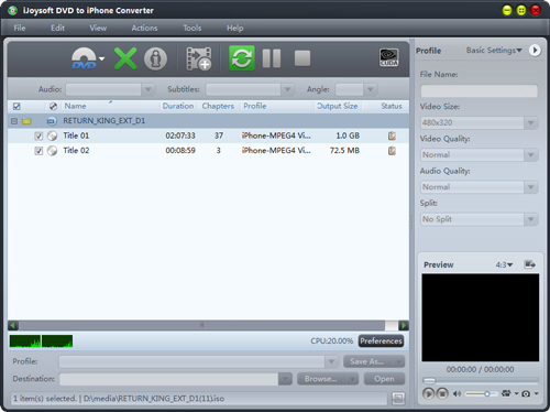 iJoysoft DVD to iPhone Converter là phần mềm chuyển đổi DVD sang iPhone mạnh mẽ và rất dễ sử dụng. Phần mềm này có thể chuyển đổi DVD sang iPhone, rip DVD sang video iPhone, chuyển DVD sang iPhone, rip DVD và chuyển đổi DVD sang iPhone MPEG 4, chuyển đổi DVD sang định dạng nhạc cho iPhone như MP3, WAV, M4A, chuyển video DVD sang iPhone với chất lượng tuyệt vời cùng tốc độ chuyển đổi siêu nhanh. Phần mềm này cho phép bạn tùy biến công việc chuyển đổi như cắt kích cỡ file đầu ra, rip một mục cụ thể nào đó từ DVD hoặc audio.