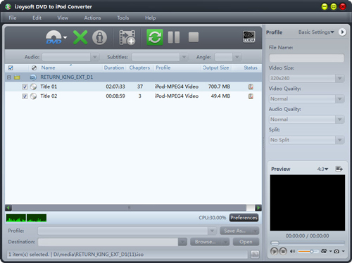 iJoysoft DVD to iPod Converter giúp bạn chuyển đổi DVD sang iPod, rip DVD sang định dạng iPod hỗ trợ và có thể chạy trên iPod như MP4, MP3, AAC và M4A. Sử dụng phần mềm này, người dùng cũng có thể rip nhạc từ các bộ phim DVD để chạy chúng trên thiết bị iPod hoặc iPhone. iJoysoft DVD to iPod Converter hỗ trợ tất cả các loại iPod và iPhone. Đây thực sự là phần mềm rip DVD sang iPod mạnh mẽ. Với tính năng thông minh Bitrate Calculator được tích hợp sẵn, người dùng cũng có thể biết được kích cỡ đầu ra trước khi chuyển đổi. Bên cạnh đó, bạn còn có thể tùy biến một profile hiện có và lưu chúng theo ý muốn riêng.