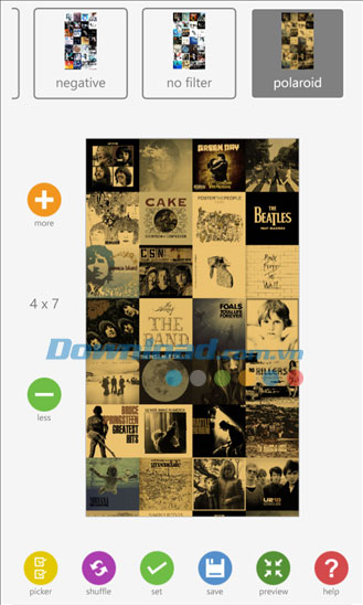 - 18 hiệu ứng ảnh - Black & White, Polaroid, Poster, Sepia, Negative, Accent Tint, Dark, Light, Hot, Cold, Gray Sketch, Color Sketch, Oily, Subtle Accent, Gray Negative, Hans Solo, Watercolors và 70s.