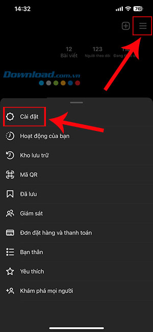 Bước 2: Tiếp tục nhấn vào biểu tượng ba dấu gạch ngang nằm ở góc trên cùng bên phải. Sau đó chọn Cài đặt từ danh mục vừa xuất hiện.