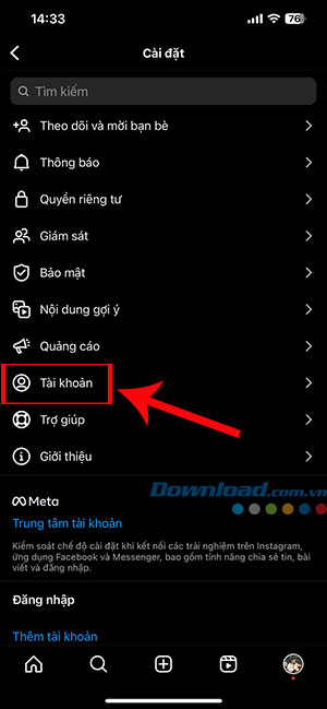 Bước 3: Trong danh sách các Cài đặt, nhấn vào Tài khoản.
