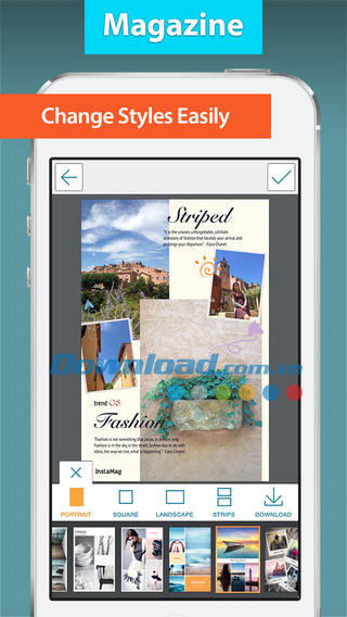 Các kiểu ghép ảnh trong InstaMag for Android bao gồm ảnh chân dung, ảnh vuông, ảnh phong cảnh và ảnh cột (trên báo), đáp ứng được mọi nhu cầu xử lý ảnh của người dùng.